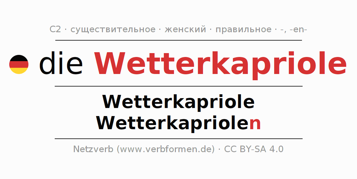 - Множественное число: die Wetterkapriolen, der Wetterkapriolen, den Wetterkapriolen, die Wetterkapriolen