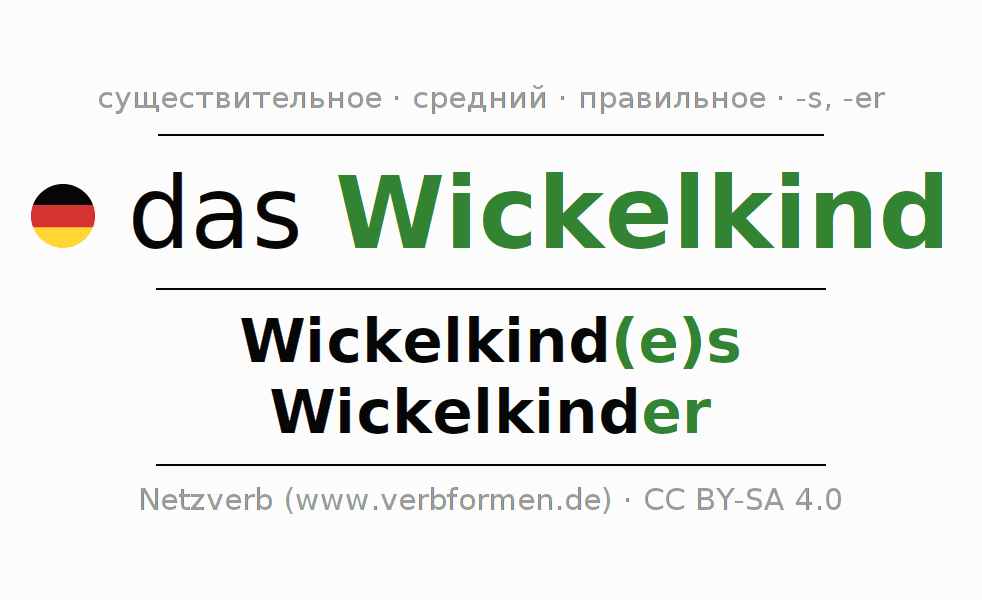 Склонение существительного Wickelkind (грудно́й ребёнок, младе́нец) даётся в родительном падеже единственного числаWickelkind(e)s и в именительном падеже множественного числа Wickelkinder. Существительное Wickelkind склоняется по сильному типу, получая окончания es/er. Грамматический род Wickelkind средний с определённым артиклем "das" Здесь можно просклонять не только Wickelkind, но и все немецкие существительные. Kомментарии ☆
