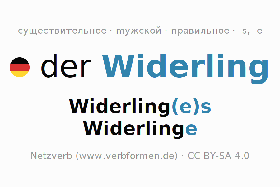 Склонение существительного Widerling (ни́зкий челове́к, отта́лкивающий челове́к) даётся в родительном падеже единственного числаWiderling(e)s и в именительном падеже множественного числа Widerlinge. Существительное Widerling склоняется по сильному типу, получая окончания es/e. Грамматический род Widerling мужской с определённым артиклем "der" Здесь можно просклонять не только Widerling, но и все немецкие существительные. Kомментарии ☆