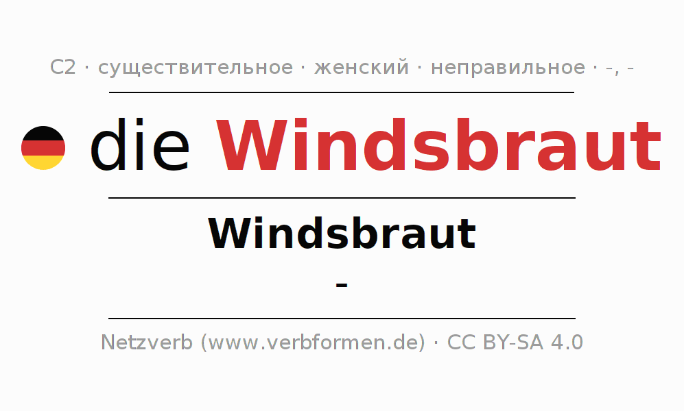 Склонение существительного Windsbraut (вихрь, буревестник) даётся в родительном падеже единственного числаWindsbraut и в именительном падеже множественного числа -. Существительное Windsbraut при склонении получает окончания -/-. Не образует форм множественного числа. Грамматический род Windsbraut женский с определённым артиклем "die" Здесь можно просклонять не только Windsbraut, но и все немецкие существительные. Существительное включён в словарный запас обладателя сертификата знания немецкого языка уровня C2. Kомментарии ☆