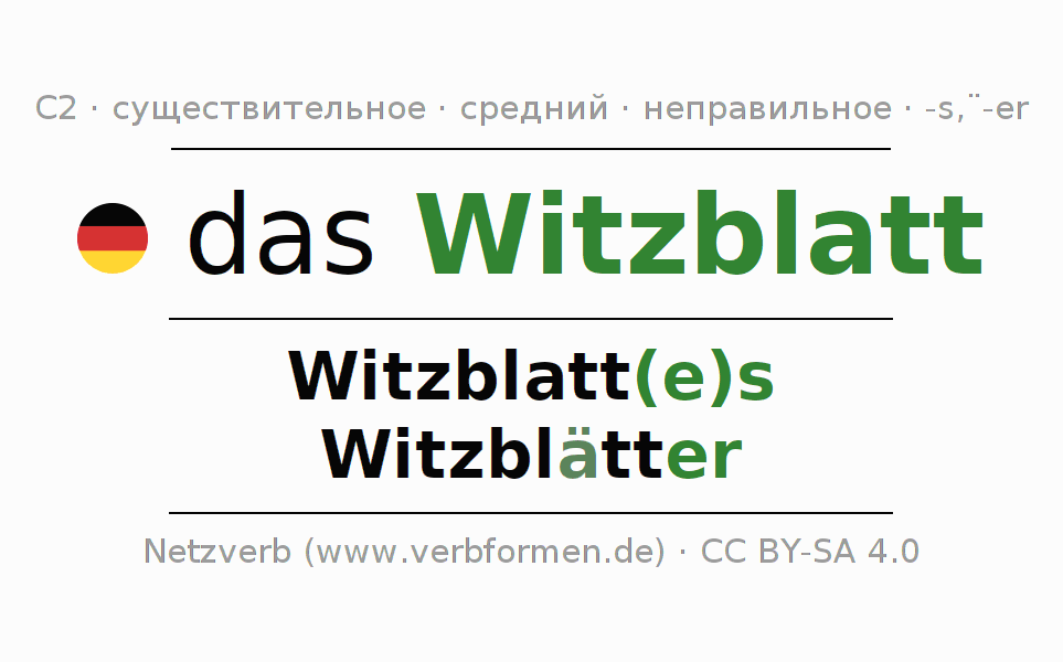 - Множественное число: die Witzblätter, der Witzblätter, den Witzblättern, die Witzblätter