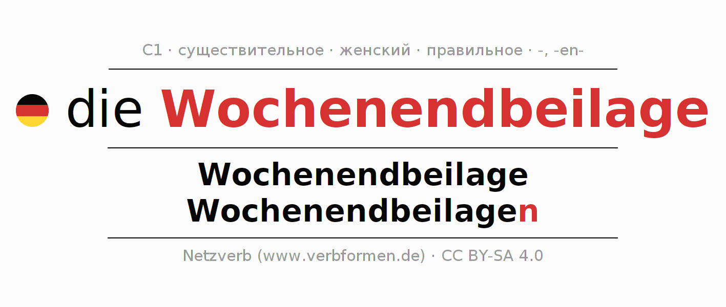 - Множественное число: die Wochenendbeilagen, der Wochenendbeilagen, den Wochenendbeilagen, die Wochenendbeilagen