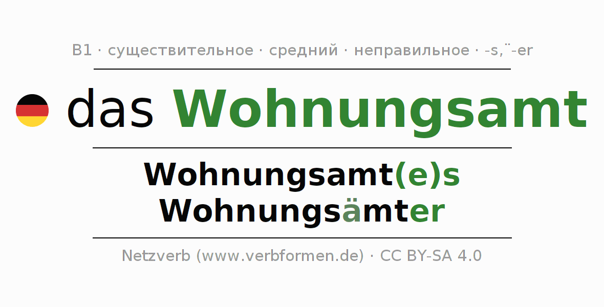 - Множественное число: die Wohnungsämter, der Wohnungsämter, den Wohnungsämtern, die Wohnungsämter