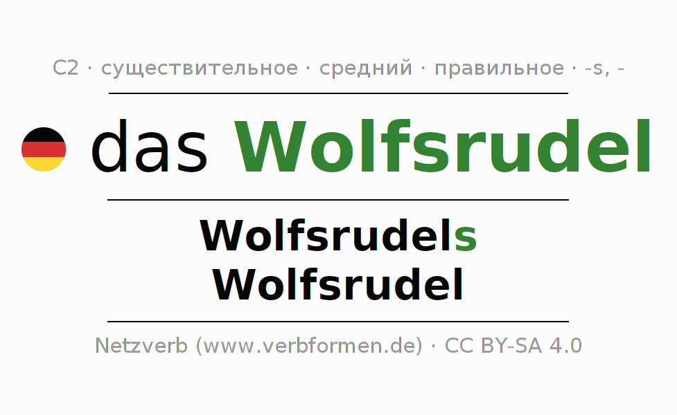 Склонение существительного Wolfsrudel (во́лчья ста́я, волчья стая) даётся в родительном падеже единственного числаWolfsrudels и в именительном падеже множественного числа Wolfsrudel. Существительное Wolfsrudel склоняется по сильному типу, получая окончания s/-. Грамматический род Wolfsrudel средний с определённым артиклем "das" Здесь можно просклонять не только Wolfsrudel, но и все немецкие существительные. Существительное включён в словарный запас обладателя сертификата знания немецкого языка уровня C2. Kомментарии ☆