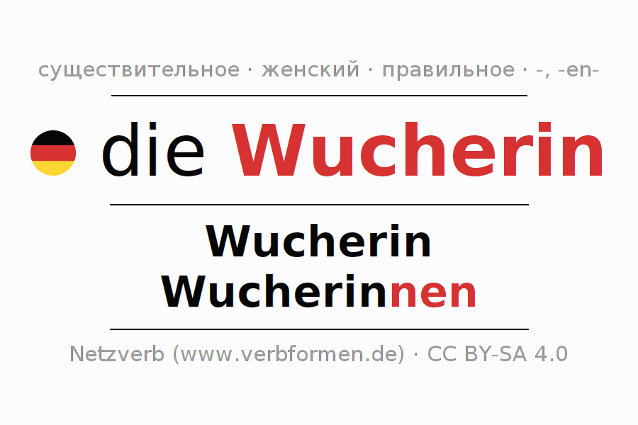 - Множественное число: die Wucherinnen, der Wucherinnen, den Wucherinnen, die Wucherinnen