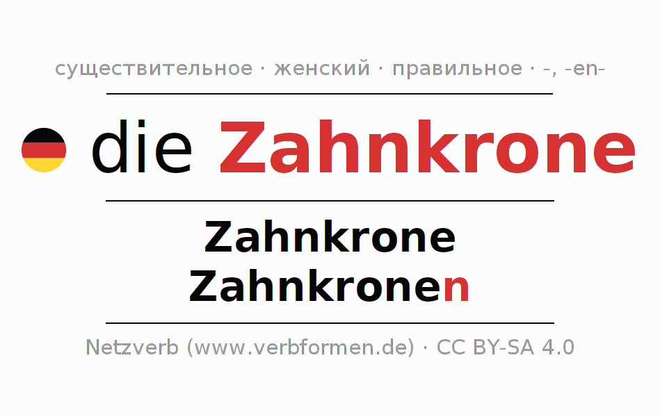 - Единственное число: die Zahnkrone, der Zahnkrone, der Zahnkrone, die Zahnkrone