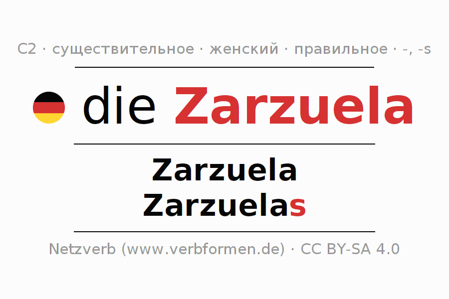 - Единственное число: die Zarzuela, der Zarzuela, der Zarzuela, die Zarzuela