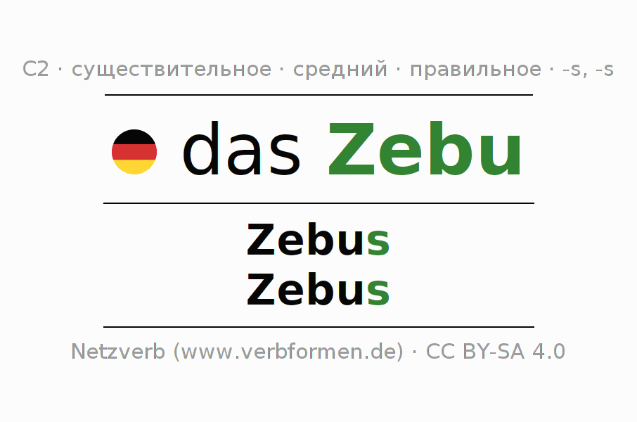 - Единственное число: das Zebu, des Zebus, dem Zebu, das Zebu