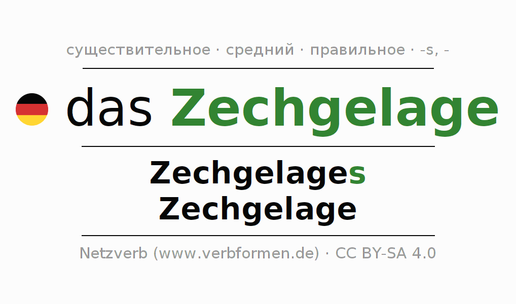- Множественное число: die Zechgelage, der Zechgelage, den Zechgelagen, die Zechgelage