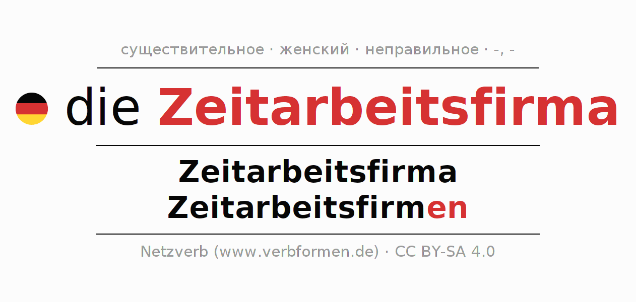 - Единственное число: die Zeitarbeitsfirma, der Zeitarbeitsfirma, der Zeitarbeitsfirma, die Zeitarbeitsfirma