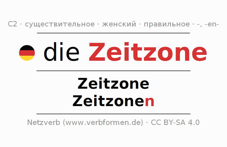 - Единственное число: die Zeitzone, der Zeitzone, der Zeitzone, die Zeitzone