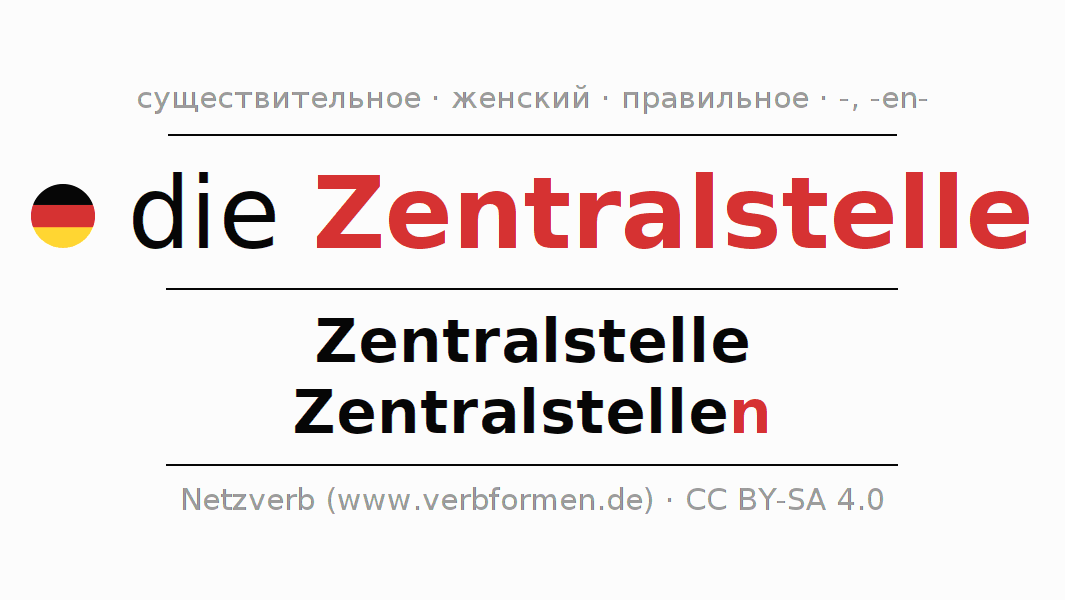 - Множественное число: die Zentralstellen, der Zentralstellen, den Zentralstellen, die Zentralstellen
