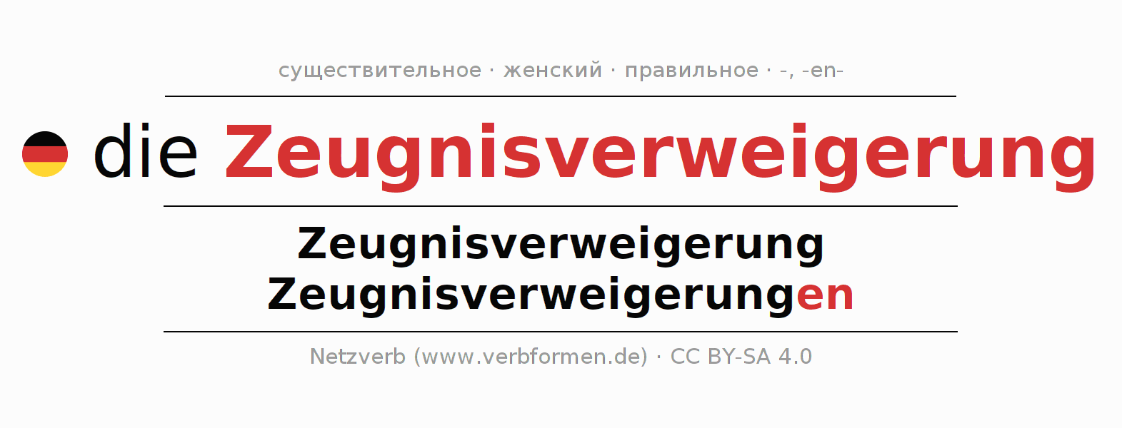 - Единственное число: die Zeugnisverweigerung, der Zeugnisverweigerung, der Zeugnisverweigerung, die Zeugnisverweigerung