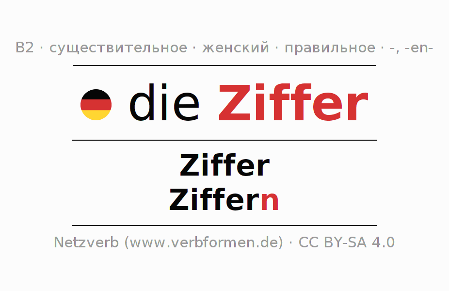 - Единственное число: die Ziffer, der Ziffer, der Ziffer, die Ziffer