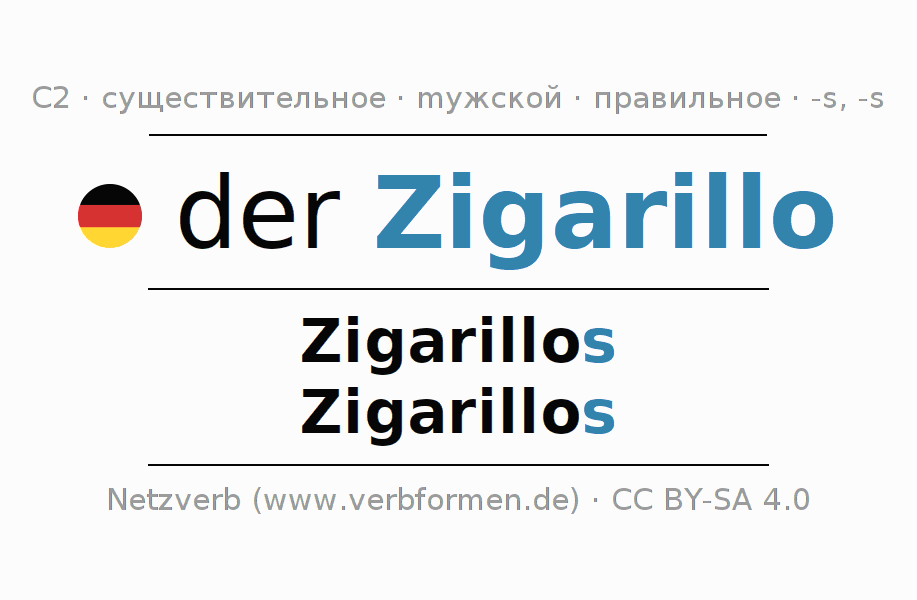 - Единственное число: der Zigarillo, des Zigarillos, dem Zigarillo, den Zigarillo