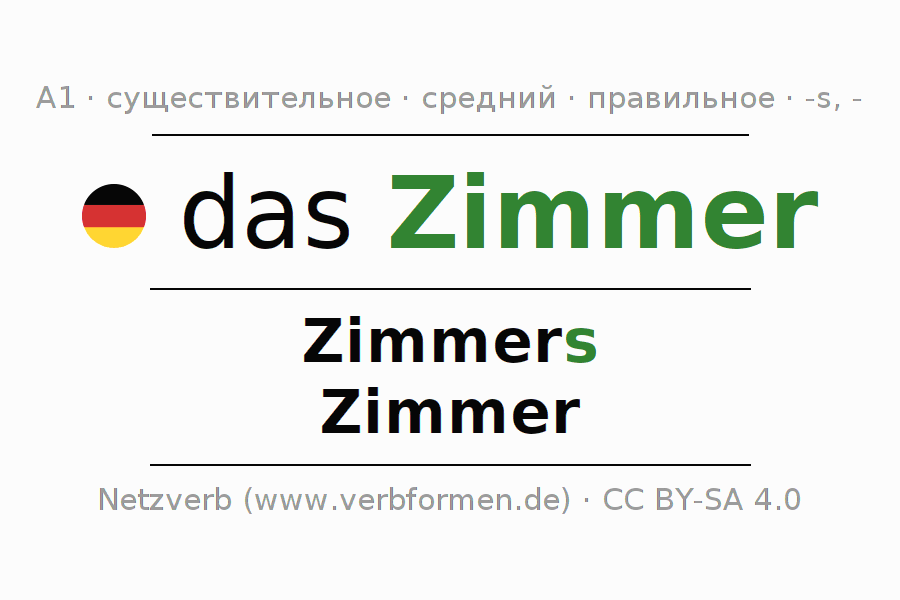 - Множественное число: die Zimmer, der Zimmer, den Zimmern, die Zimmer