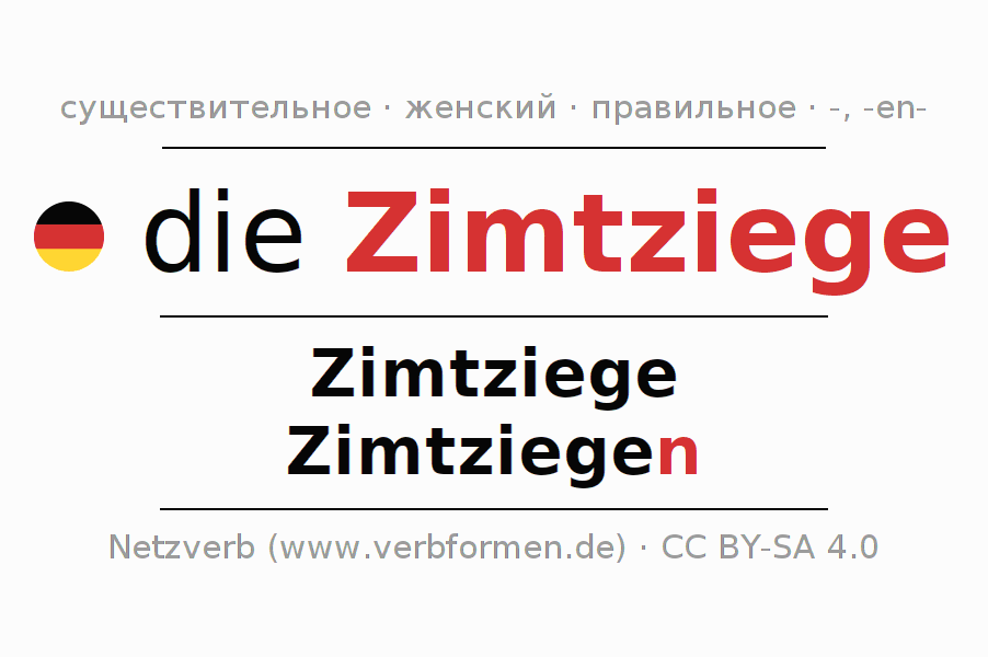 - Множественное число: die Zimtziegen, der Zimtziegen, den Zimtziegen, die Zimtziegen