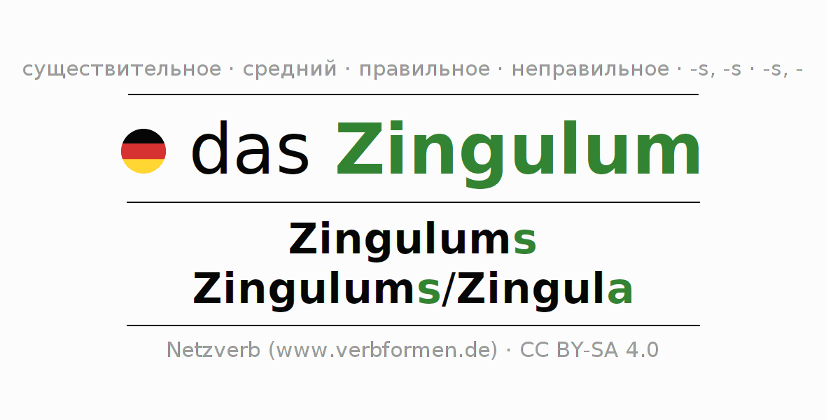Склонение существительного Zingulum даётся в родительном падеже единственного числаZingulums и в именительном падеже множественного числа Zingulums/Zingula. Существительное Zingulum склоняется по сильному типу, получая окончания s/um/a. Грамматический род Zingulum средний с определённым артиклем "das" Здесь можно просклонять не только Zingulum, но и все немецкие существительные. Kомментарии ☆
