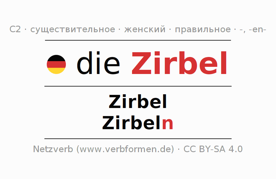 Склонение существительного Zirbel (кедр европе́йский, кованое украшение) даётся в родительном падеже единственного числаZirbel и в именительном падеже множественного числа Zirbeln. Существительное Zirbel склоняется по слабому типу, получая окончания -/n. Грамматический род Zirbel женский с определённым артиклем "die" Здесь можно просклонять не только Zirbel, но и все немецкие существительные. Существительное включён в словарный запас обладателя сертификата знания немецкого языка уровня C2. Kомментарии ☆