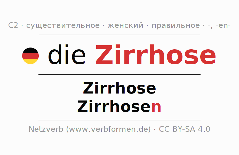 - Множественное число: die Zirrhosen, der Zirrhosen, den Zirrhosen, die Zirrhosen