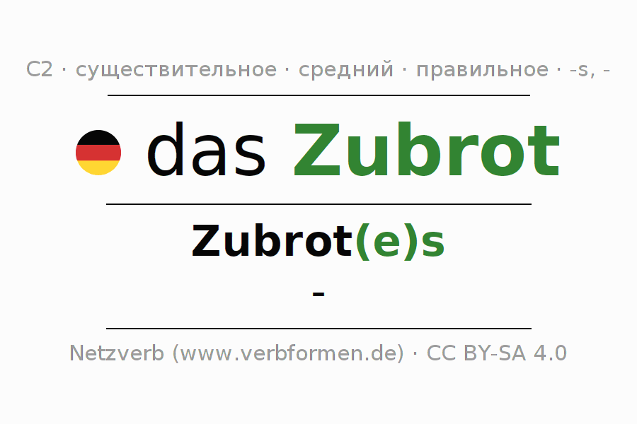 Склонение существительного Zubrot (гарнир, дополнение) даётся в родительном падеже единственного числаZubrot(e)s и в именительном падеже множественного числа -. Существительное Zubrot склоняется по сильному типу, получая окончания es/-. Не образует форм множественного числа. Грамматический род Zubrot средний с определённым артиклем "das" Здесь можно просклонять не только Zubrot, но и все немецкие существительные. Существительное включён в словарный запас обладателя сертификата знания немецкого языка уровня C2. Kомментарии ☆