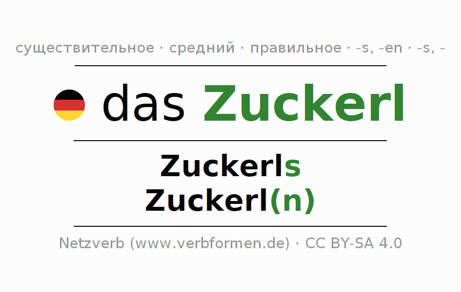 Склонение существительного Zuckerl (караме́лька, конфета) даётся в родительном падеже единственного числаZuckerls и в именительном падеже множественного числа Zuckerl(n). Существительное Zuckerl склоняется по смешанному типу, получая окончания s/n/-. Грамматический род Zuckerl средний с определённым артиклем "das" Здесь можно просклонять не только Zuckerl, но и все немецкие существительные. Kомментарии ☆