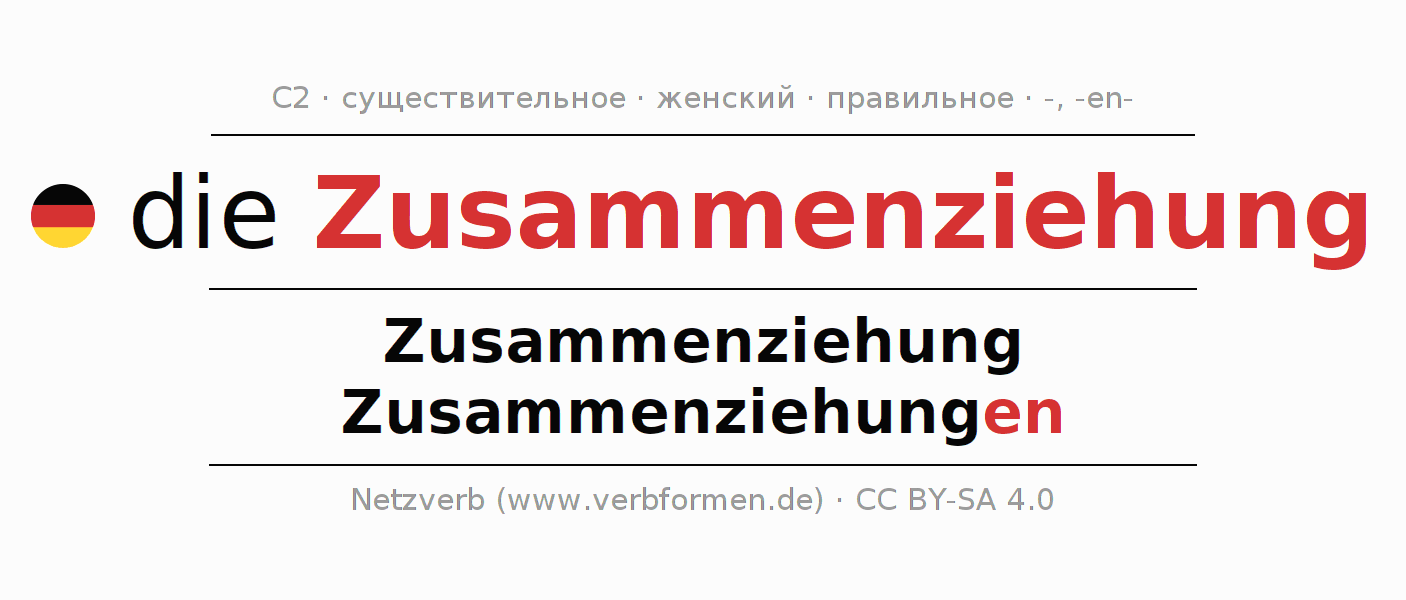 - Единственное число: die Zusammenziehung, der Zusammenziehung, der Zusammenziehung, die Zusammenziehung