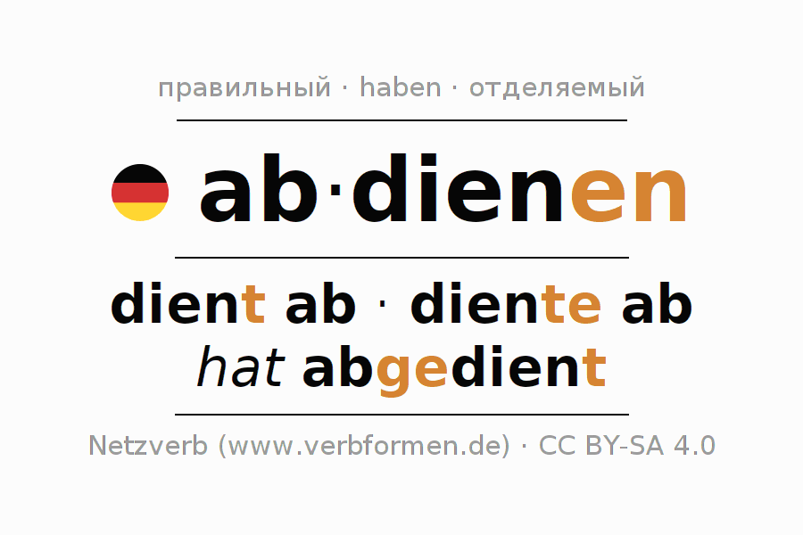 - Презенс: ich dien(e) ab, du dienst ab, er dient ab, wir dienen ab, ihr dient ab, sie dienen ab