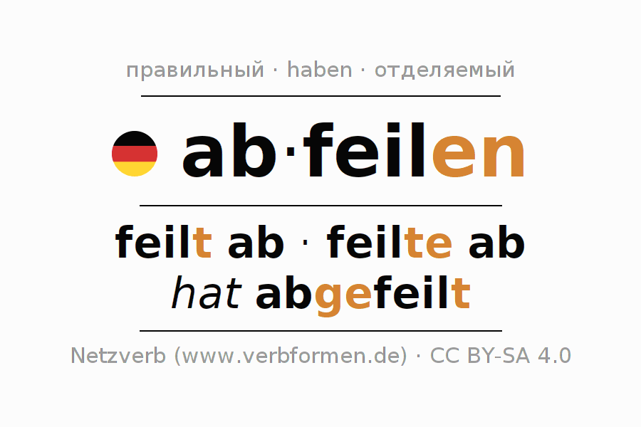 - Презенс: ich feil(e) ab, du feilst ab, er feilt ab, wir feilen ab, ihr feilt ab, sie feilen ab