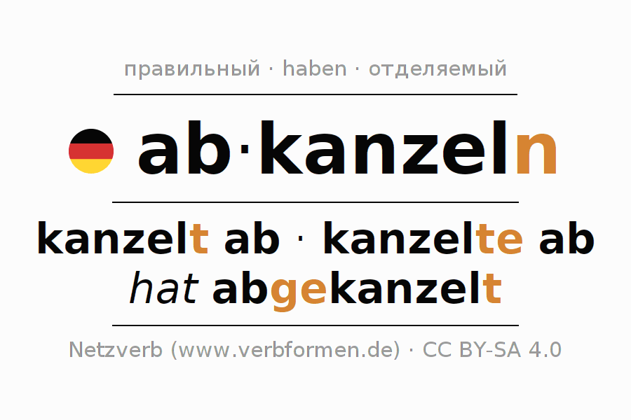 - Презенс: ich kanz(e)le ab, du kanzelst ab, er kanz(e)le ab, wir kanzeln ab, ihr kanzelt ab, sie kanzeln ab