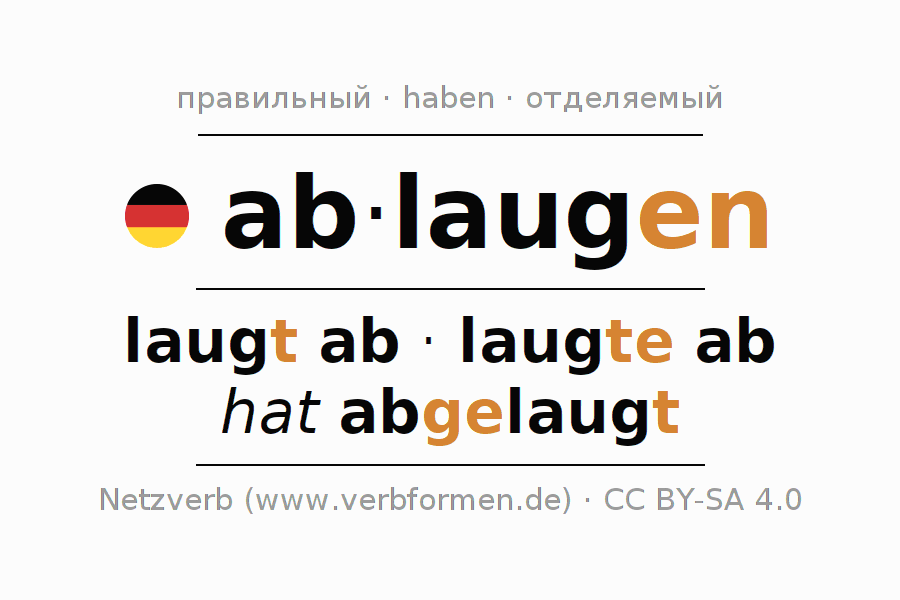- Презенс: laug(e) (du) ab, laugen wir ab, laugt (ihr) ab, laugen Sie ab