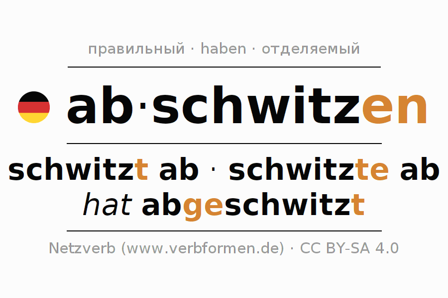 - Презенс: schwitz(e) (du) ab, schwitzen wir ab, schwitzt (ihr) ab, schwitzen Sie ab