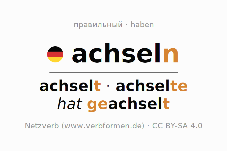 Глагол achseln спрягается в индикативе Действительный залог (актив) в настоящем, прошедшем и будущем времени