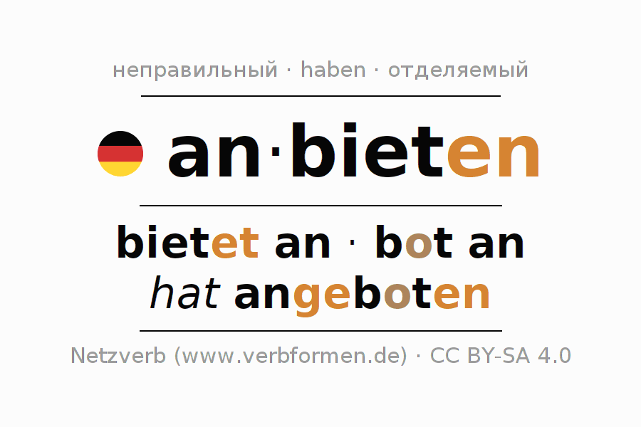 Спряжение глагола anbieten (предлагать, вызваться) неправильное. Формы глагола bietet an, bot an, hat angeboten. Чередующиеся гласные ie - o - o в корне: В качестве вспомогательного глагола к anbieten употребляется "haben". Глагол anbieten может употребляться в возвратной форме. Приставка an- для anbieten отделяемая. Склоняется в Действительный залог (актив) и употребляется в Главное предложение. Для лучшего понимания приводится большое количество примеров употребления глагола anbieten. Для тренировки и закрепления навыков имеются также бесплатные рабочие листы по anbieten. Можно не только anbieten спрягать, но и все немецкие глаголы. Глагол включён в словарный запас обладателя сертификата знания немецкого языка уровня A1. Kомментарии ☆