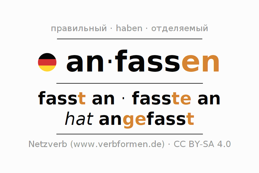 - Презенс: ich fass(e) an, du fasst an, er fasst an, wir fassen an, ihr fasst an, sie fassen an