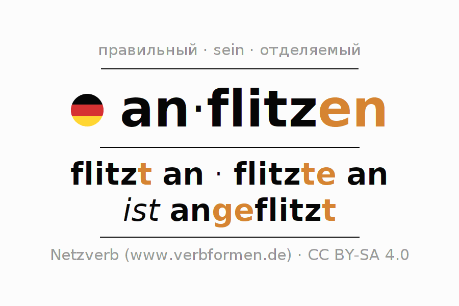 Глагол anflitzen спрягается в индикативе Действительный залог (актив) в настоящем, прошедшем и будущем времени