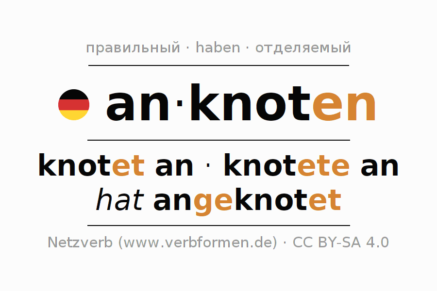 - Презенс: knot(e) (du) an, knoten wir an, knotet (ihr) an, knoten Sie an