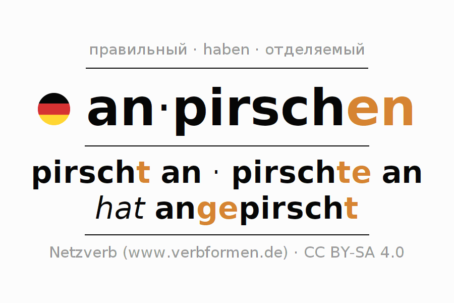 - Презенс: pirsch(e) (du) an, pirschen wir an, pirscht (ihr) an, pirschen Sie an