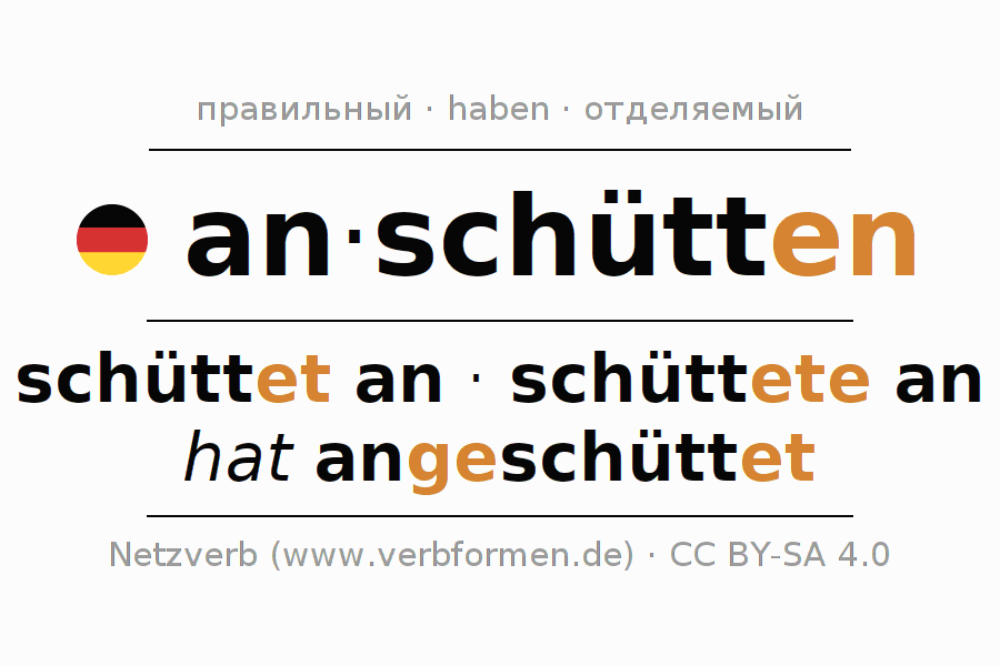 - Презенс: ich schütte an, du schüttest an, er schütte an, wir schütten an, ihr schüttet an, sie schütten an