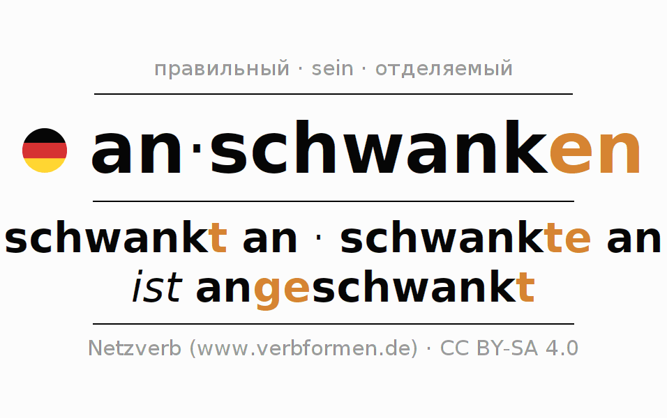 Глагол 'an·schwanken' онлайн как таблица глаголов со всеми наглядно представленными формами. Значение глагола an·schwanken таким образом является помощью для выполнения домашних заданий; подготовки к экзаменам и контрольным работам, а также к урокам немецкого языка; для обучения в вузах и при получении образования для взрослых. Именно для изучающих немецкий язык – правильное спряжение глаголов (schwankt an - schwankte an - ist angeschwankt) является решающим фактором.