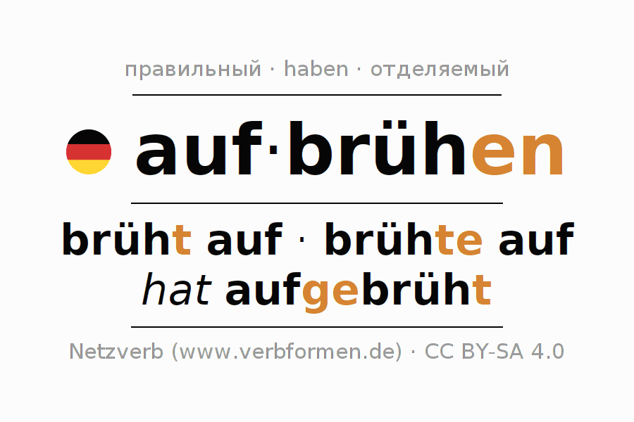 - Презенс: brüh(e) (du) auf, brüh(e)n wir auf, brüht (ihr) auf, brüh(e)n Sie auf