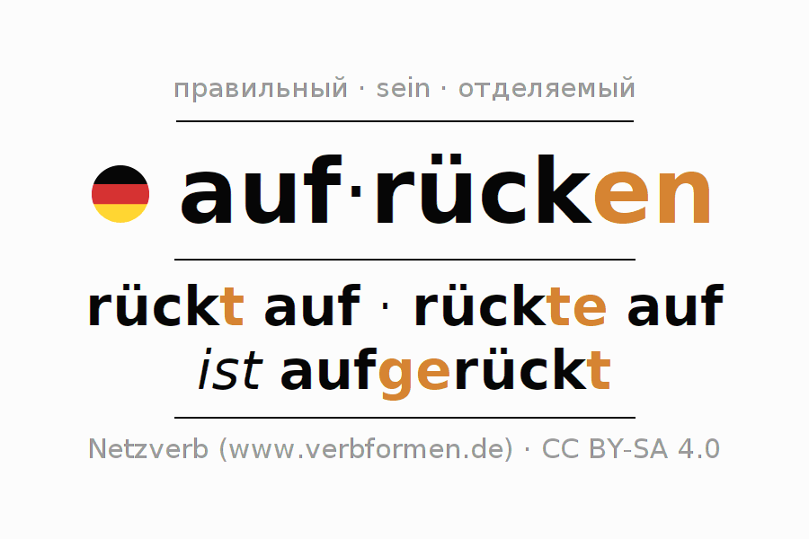 - Презенс: rück(e) (du) auf, rücken wir auf, rückt (ihr) auf, rücken Sie auf