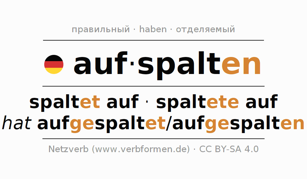 Глагол 'auf·spalten' онлайн как таблица глаголов со всеми наглядно представленными формами. Значение глагола auf·spalten таким образом является помощью для выполнения домашних заданий; подготовки к экзаменам и контрольным работам, а также к урокам немецкого языка; для обучения в вузах и при получении образования для взрослых. Именно для изучающих немецкий язык – правильное спряжение глаголов (spaltet auf - spaltete auf - hat aufgespaltet/aufgespalten) является решающим фактором.