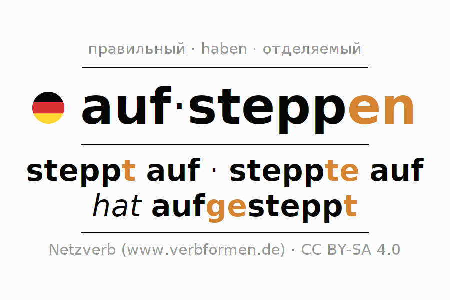 - Презенс: stepp(e) (du) auf, steppen wir auf, steppt (ihr) auf, steppen Sie auf