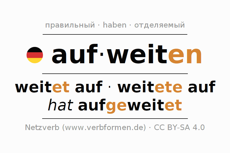 - Презенс: weit(e) (du) auf, weiten wir auf, weitet (ihr) auf, weiten Sie auf