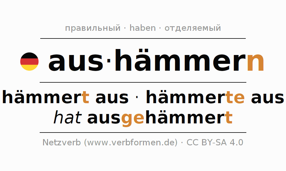 - Презенс: ich hämm(e)re aus, du hämmerst aus, er hämm(e)re aus, wir hämmern aus, ihr hämmert aus, sie hämmern aus