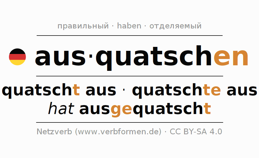 Глагол 'aus·quatschen' онлайн как таблица глаголов со всеми наглядно представленными формами. Значение глагола aus·quatschen таким образом является помощью для выполнения домашних заданий; подготовки к экзаменам и контрольным работам, а также к урокам немецкого языка; для обучения в вузах и при получении образования для взрослых. Именно для изучающих немецкий язык – правильное спряжение глаголов (quatscht aus - quatschte aus - hat ausgequatscht) является решающим фактором.