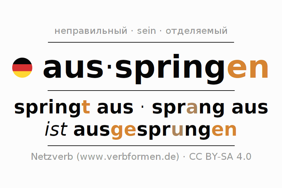 - Презенс: spring(e) (du) aus, springen wir aus, springt (ihr) aus, springen Sie aus