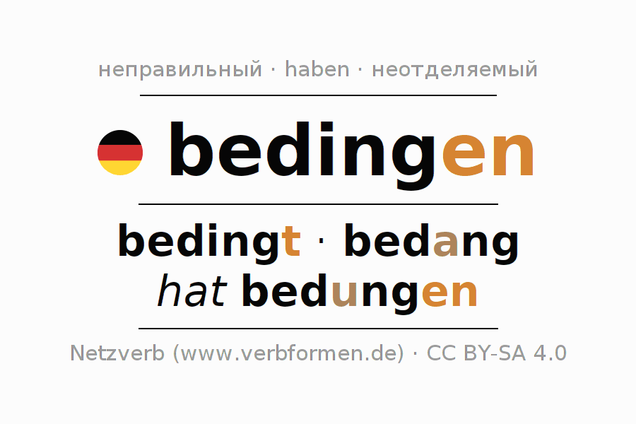 Глагол bedingen (unr) спрягается в индикативе Действительный залог (актив) в настоящем, прошедшем и будущем времени