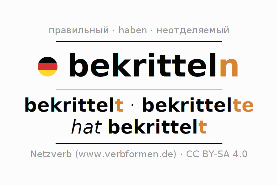 Глагол 'bekritteln' онлайн как таблица глаголов со всеми наглядно представленными формами. Значение глагола bekritteln таким образом является помощью для выполнения домашних заданий; подготовки к экзаменам и контрольным работам, а также к урокам немецкого языка; для обучения в вузах и при получении образования для взрослых. Именно для изучающих немецкий язык – правильное спряжение глаголов (bekrittelt - bekrittelte - hat bekrittelt) является решающим фактором.